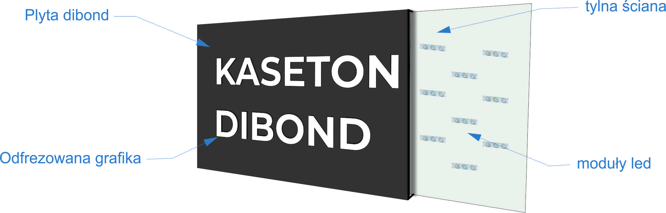 Standardowy kaseton z dibondu ma głębokość 8cm. Wielkość ustalamy indywidualnie, mając jednakże na uwadze, że maksymalna wielkość jednego modułu wynosi 135cm x 395cm Oznacza to, że jesteśmy w stanie wyprodukować każdy rozmiar nie większy i włącznie z tą wielkością. Przód kasetonu zrobiony jest z odfrezowanej płyty kompozytowej z wyciętą grafiką, podklejoną pleksi. Na tylnej ściance montujemy oświetlenie led. Zazwyczaj wewnątrz montujemy również zasilacz.