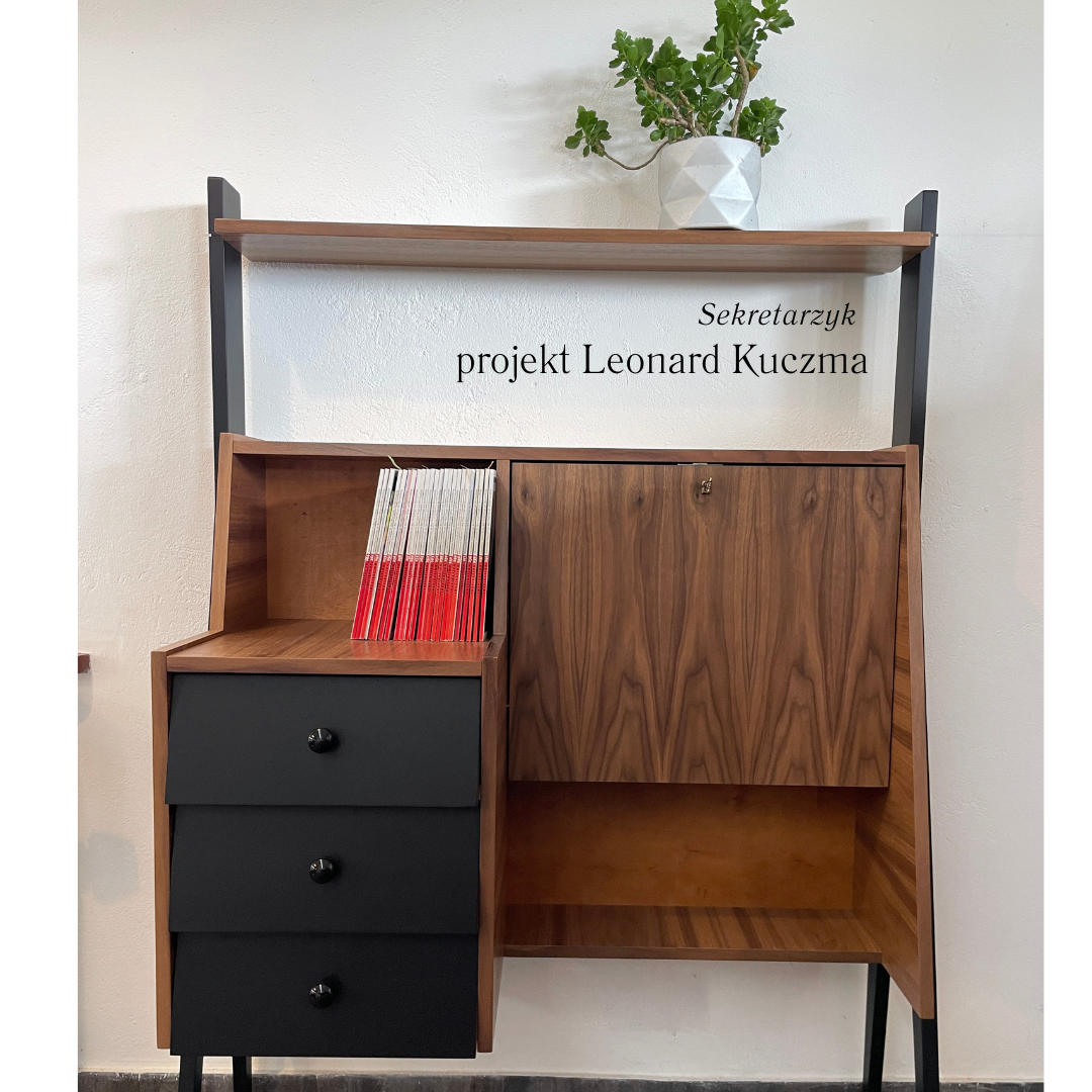 Poniżej prezentujemy odtworzony współcześnie przez kuczma.pl, na podstawie projektu z lat 50-tych Leonarda Kuczma, sekretarzyk. Sekretarzyk wykonany w oparciu o zachowane rysunki ojca oraz zdobyte fotografie, powstałego w latach 50-tych prototypu.